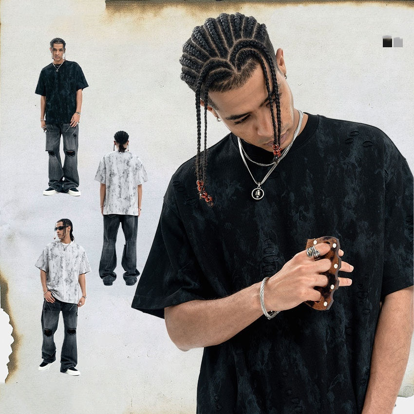 Ripped Edging Design Small Neckline Loose National Fashion Short Sleeve T-shirt