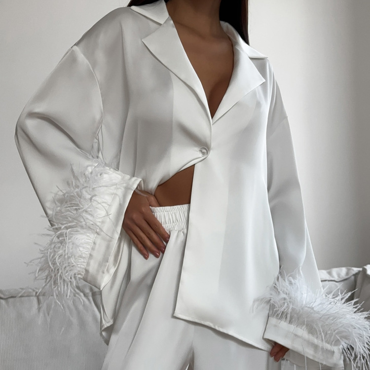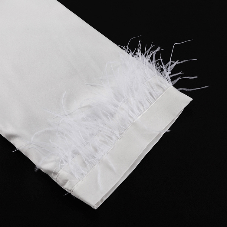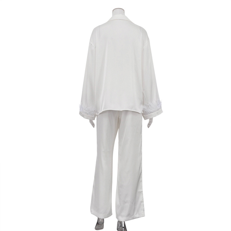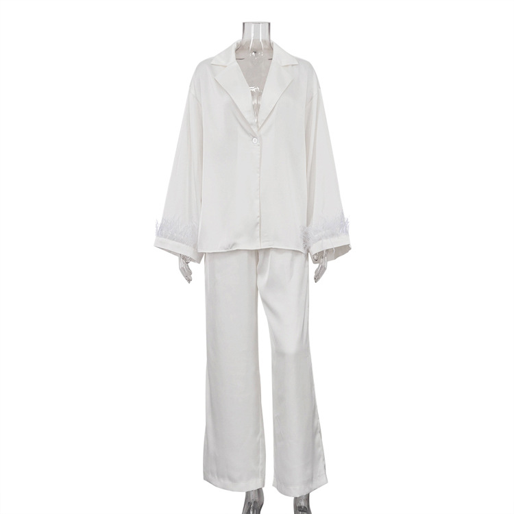 Stitching Design Feather Long Sleeve Lapel Top Casual Trousers Two-piece Set